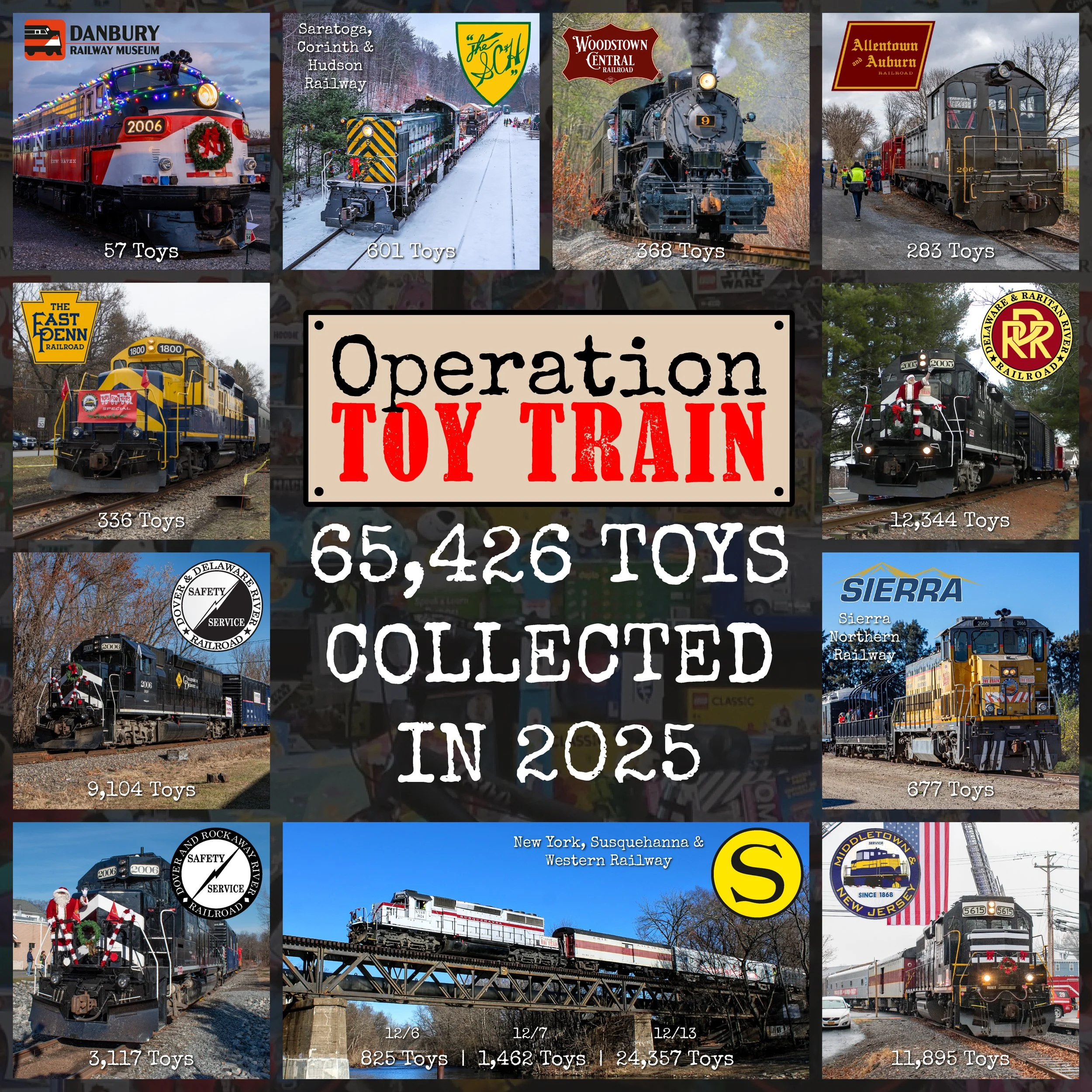 The numbers are in for Operation Toy Train’s 2025 toy season! Our trains made 71 stops in 68 towns across five states and collected a grand total of 65,426 toys this year, shattering every internal record for our organization and representing a 48% increase over our 2024 collection trains! Plus, we had the most toys we’ve ever collected in a single day on a single run (24,347).